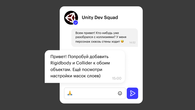 В Telegram-чате общаются эксперты и участники других курсов направления. Сможете узнать новости геймдева, обсудить сложные темы или задачи курса, а заодно найти партнёров для совместных проектов.